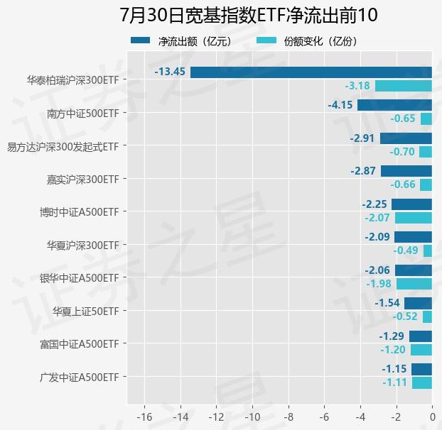 當(dāng)日,還有127只寬基指數(shù)ETF基金出現(xiàn)資金凈流出,其中華泰柏瑞滬深300ETF(510300)凈流出排首位,其份額減少了3.18億份,凈流出額為13.45億元。