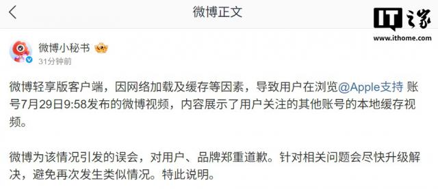 微博輕享版客戶端由于網(wǎng)絡(luò)加載及緩存等因素,致使用戶在瀏覽@Apple支持賬號7月29日9:58發(fā)布的微博視頻時,所展示的內(nèi)容為用戶關(guān)注的其他賬號的本地緩存視頻。