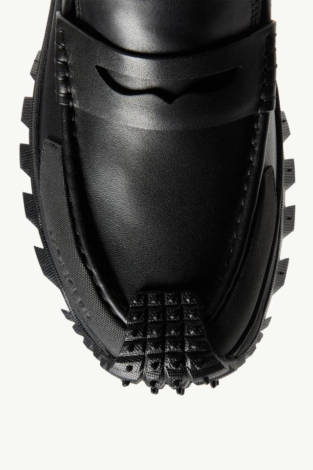 這雙全黑色的樂福鞋乍一看極具沖擊力:尖銳的Vibram Megagrip從鞋底延伸到鞋面,橡膠鞋底同樣延伸至鞋面。再加上科技感滿滿的TPU擾流板和具有雕塑感的空氣動(dòng)力學(xué)中底,造就了一款近乎狂野的鞋款設(shè)計(jì)。原本厚重結(jié)實(shí)的運(yùn)動(dòng)鞋,如今搖身一變,成為專為戶外設(shè)計(jì)的柔軟皮革樂福鞋。