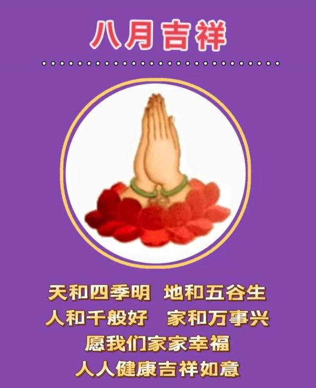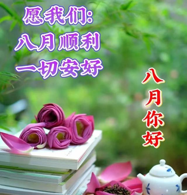 八月已到,清風送爽。愿你在新的月份事業(yè)順遂、步步高升;家庭和睦、幸福美滿。愿工作熱火朝天,生活如詩如畫,幸福與成功常伴人生。祝你八月喜樂!