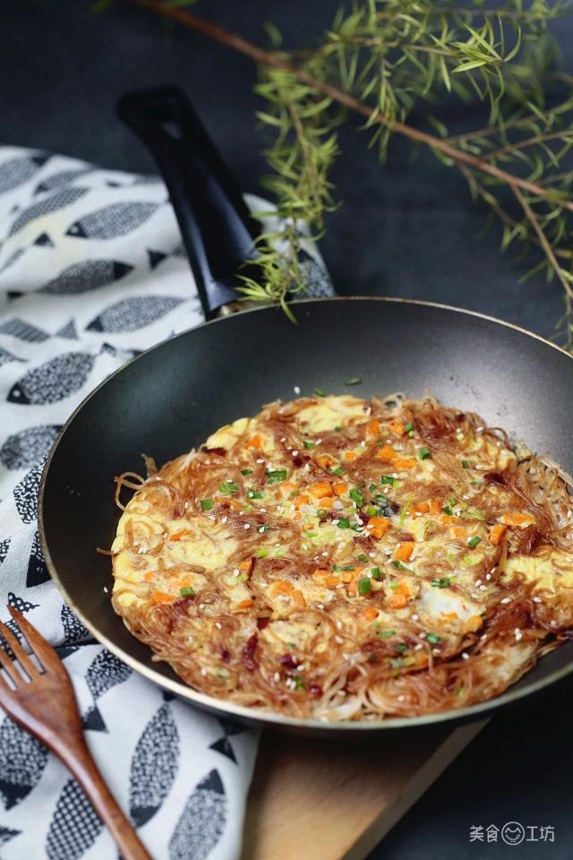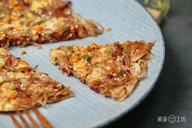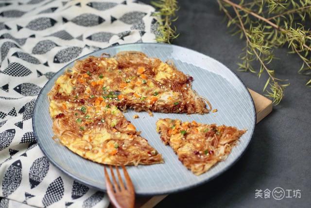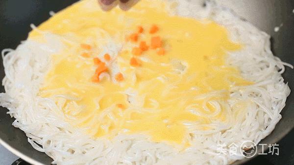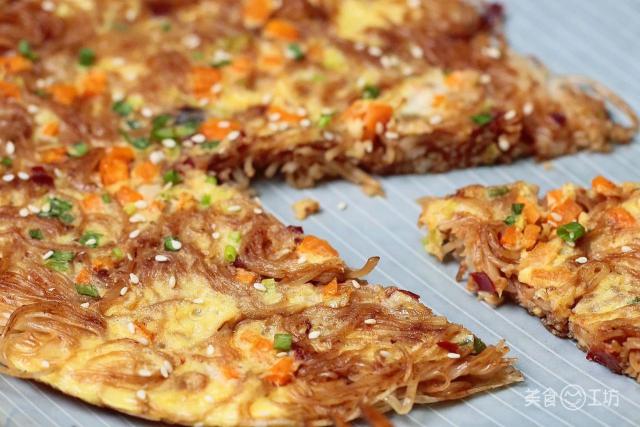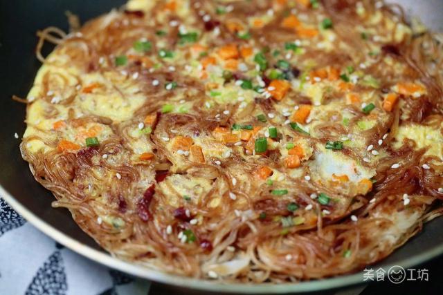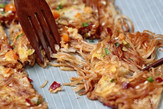 先把面條在沸水中快速汆燙撈出,放入平底鍋中擠壓、煎至底面金黃成型,然后抹上鮮香醬料,倒入雞蛋液,再撒上喜歡的蔬菜粒。