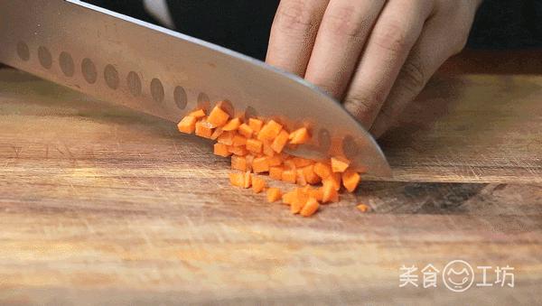 2. 胡蘿卜洗凈切丁,蔥切成蔥花,雞蛋打散備用。
