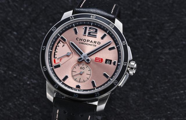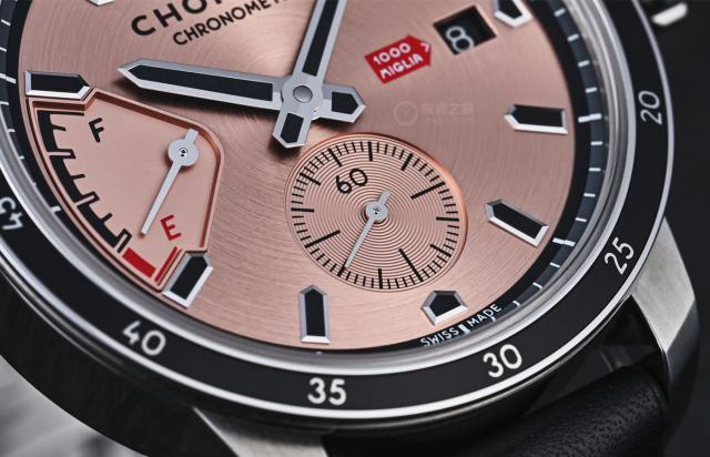 除了堅固且打磨精細(xì)的表殼,這款表的表盤通過諸多細(xì)節(jié),充分展現(xiàn)了其賽車基因。首先是經(jīng)過鍍鋅處理、人氣很高的三文魚色表盤,采用環(huán)形緞面拉絲打磨工藝,既完美致敬了古董賽車的手工鋁制車身和經(jīng)典金屬儀表盤,又與經(jīng)唱片紋裝飾的小秒盤相互呼應(yīng)。特別是 9 點位靈感源自賽車燃油表的能量顯示,搭配橡膠襯里、印有經(jīng)典鄧祿普賽車胎紋的黑色小牛皮穿孔表帶,以及日歷旁邊象征 Mille Miglia 傳奇賽事的經(jīng)典紅色箭頭,瞬間將你帶入激情四溢的比賽現(xiàn)場。此外,它 100 米的防水深度讓你日常佩戴毫無顧慮。