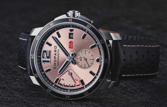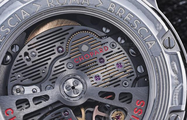除了外觀,這款表和計時表最大的不同在于,它搭載了真正的自產(chǎn)機芯。這款外觀酷炫、與山鷹大三針同平臺的 01.02 - M 機芯,是目前蕭邦的主力大擺陀自動機芯,直徑 28.8 毫米,厚度 4.95 毫米,擺頻每小時 28,800 次,擁有 60 小時動力儲存,具備瑞士官方天文臺認(rèn)證和停秒功能。除了這些基本性能,這款機芯的裝飾風(fēng)格也很值得一提,擺陀精準(zhǔn)還原古典賽車方向盤造型,所有夾板進行了源自發(fā)動機散熱格柵的橫條鏤空處理,讓這枚機芯看起來就像一部動力強勁的引擎。對于這樣一款渾身充滿賽車基因的腕表,喜歡的朋友可要抓緊了,畢竟它僅生產(chǎn) 250 只。