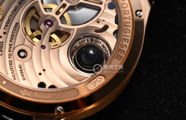 翻轉(zhuǎn)腕表,因使用自制的手動上鏈 81925 型機芯,無自動擺陀遮擋(但被大面積夾板覆蓋),能看到晝夜顯示的小球體。以這個晝夜顯示球體為中心向四周擴散一圈圈環(huán)形日內(nèi)瓦紋,鏤空夾板均經(jīng)過鍍金處理,宛如石子投入湖面泛起的金色漣漪。