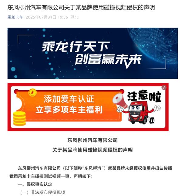 昨日晚間,“乘龍卡車”公眾號發(fā)布消息,7月31日,東風(fēng)柳州汽車有限公司發(fā)布關(guān)于某品牌使用碰撞視頻侵權(quán)的聲明。