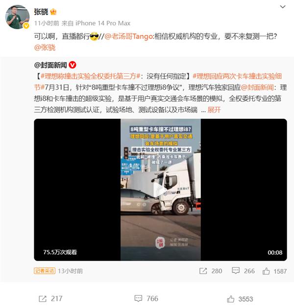 昨日晚間,理想汽車產(chǎn)品負(fù)責(zé)人 @老湯哥 Tango 回應(yīng)理想i8和卡車對撞事件,稱:“相信權(quán)威機(jī)構(gòu)的專業(yè),要不來復(fù)測一把? @張驍 ”隨后,理想汽車產(chǎn)品線負(fù)責(zé)人張驍回應(yīng):“可以啊,直播都行?!?/p>