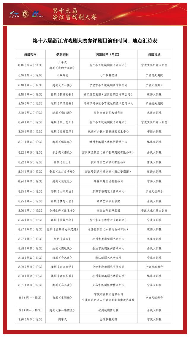 8月16日至9月26日,第十六屆浙江省戲劇大賽暨周信芳戲劇季將在寧波璀璨綻放。屆時,25臺大戲和7臺小戲將在寧波8大劇院輪番上演。