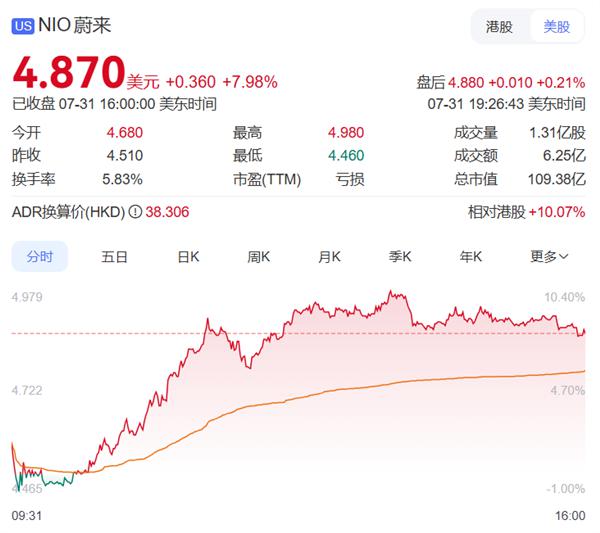 截至7月31日收盤,蔚來美股收盤價為4.87美元,漲幅達(dá)到7.98%,盤中一度漲超10%,最新市值為109.38億美元。