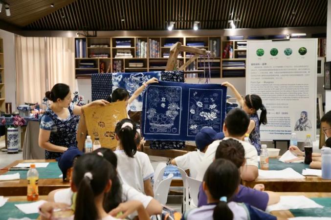 隨后,學(xué)員們走進藥斑布體驗基地,在上海市非物質(zhì)文化遺產(chǎn)代表性項目藥斑布印染技藝嘉定區(qū)代表性傳承人胡蘇芬的指導(dǎo)下,體驗了完整的印染流程。大家充分發(fā)揮創(chuàng)意,嘗試不同的印染技巧和圖案設(shè)計。當看到自己親手染制的布料呈現(xiàn)出獨一無二的花紋時,董宸希小朋友迫不及待地向他人展示自己的作品,說道:“這塊布用灰纈做了玫瑰花的圖案,我還嘗試染出了漂亮的漸變色,既實用又有紀念意義,回去一定要分享給同學(xué)和爸媽看?!?/p>