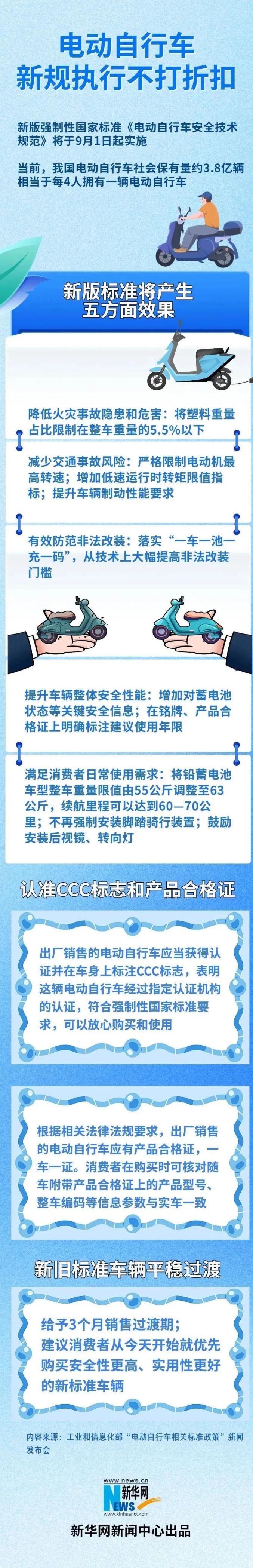 《技術(shù)規(guī)范》設(shè)定了兩個(gè)實(shí)施時(shí)間,生產(chǎn)環(huán)節(jié)實(shí)施時(shí)間是2025年9月1日,銷(xiāo)售環(huán)節(jié)實(shí)施時(shí)間是2025年12月1日。9月1日后,生產(chǎn)企業(yè)新生產(chǎn)的電動(dòng)自行車(chē)都要符合新標(biāo)準(zhǔn)要求。不過(guò),2025年9月1日之前按照舊標(biāo)準(zhǔn)生產(chǎn)的車(chē)輛可以繼續(xù)銷(xiāo)售至2025年11月30日,從2025年12月1日起,所有銷(xiāo)售的電動(dòng)自行車(chē)都必須符合新標(biāo)準(zhǔn)。