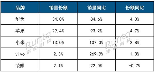 華為銷量同比增長84.6%,以34.0%的市場份額排在線上市場的第一。