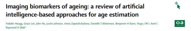 [ 1 ] Haugg F, Lee G, He J, Johnson J, Zapaishchykova A, Bitterman DS, Kann BH, Aerts HJWL, Mak RH. Imaging biomarkers of ageing: a review of artificial intelligence - based approaches for age estimation. Lancet Healthy Longev. 2025;Vol ( x ) :1 - 11. DOI:10.1016/j.lanhl.2025.100728