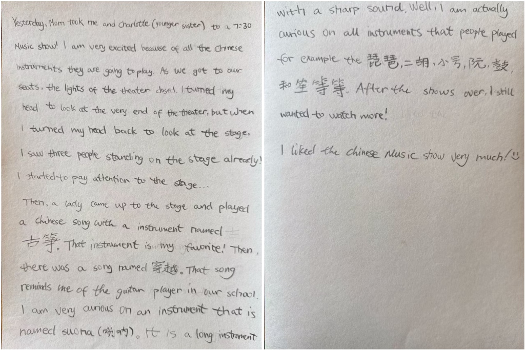 美籍華人小朋友Chloe Wang寄來了用鉛筆手寫的英文信,信中表達(dá)了初次接觸國樂的驚喜:“我對所有樂器都充滿好奇,以后一定要多來看?!?/p>