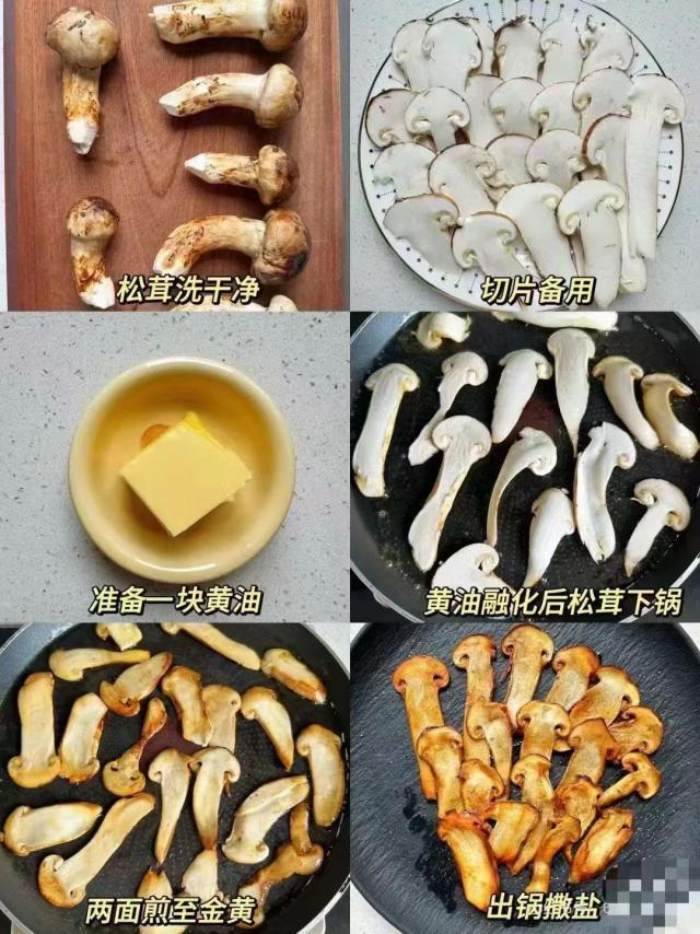 經(jīng)典又讓人垂涎的吃法,是《舌尖上的中國 1》里的黃油煎松茸。把洗凈的鮮松茸切片,放入加熱后的黃油中煎制。等松茸充分散發(fā)出香味后,根據(jù)個人口味加入鹽或者黑胡椒粉就可以吃了。