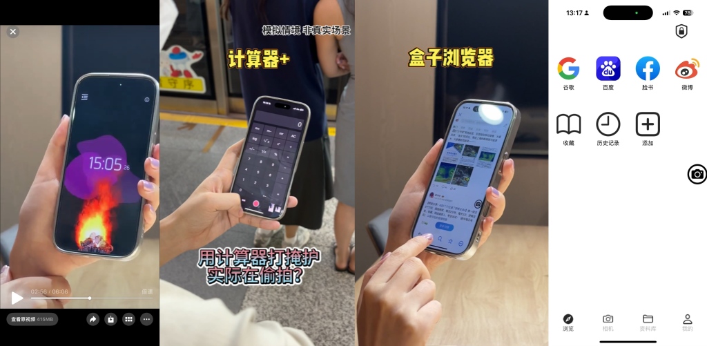 此外,7 號(hào)工具、盒子瀏覽器(box browser)、計(jì)算器 +(密碼計(jì)算器 - 隱藏私人相冊視頻)和 SSCar(取證相機(jī))還可偽裝成鎖屏、瀏覽器頁面、社交平臺(tái)和計(jì)算器等應(yīng)用,并實(shí)時(shí)拍攝。