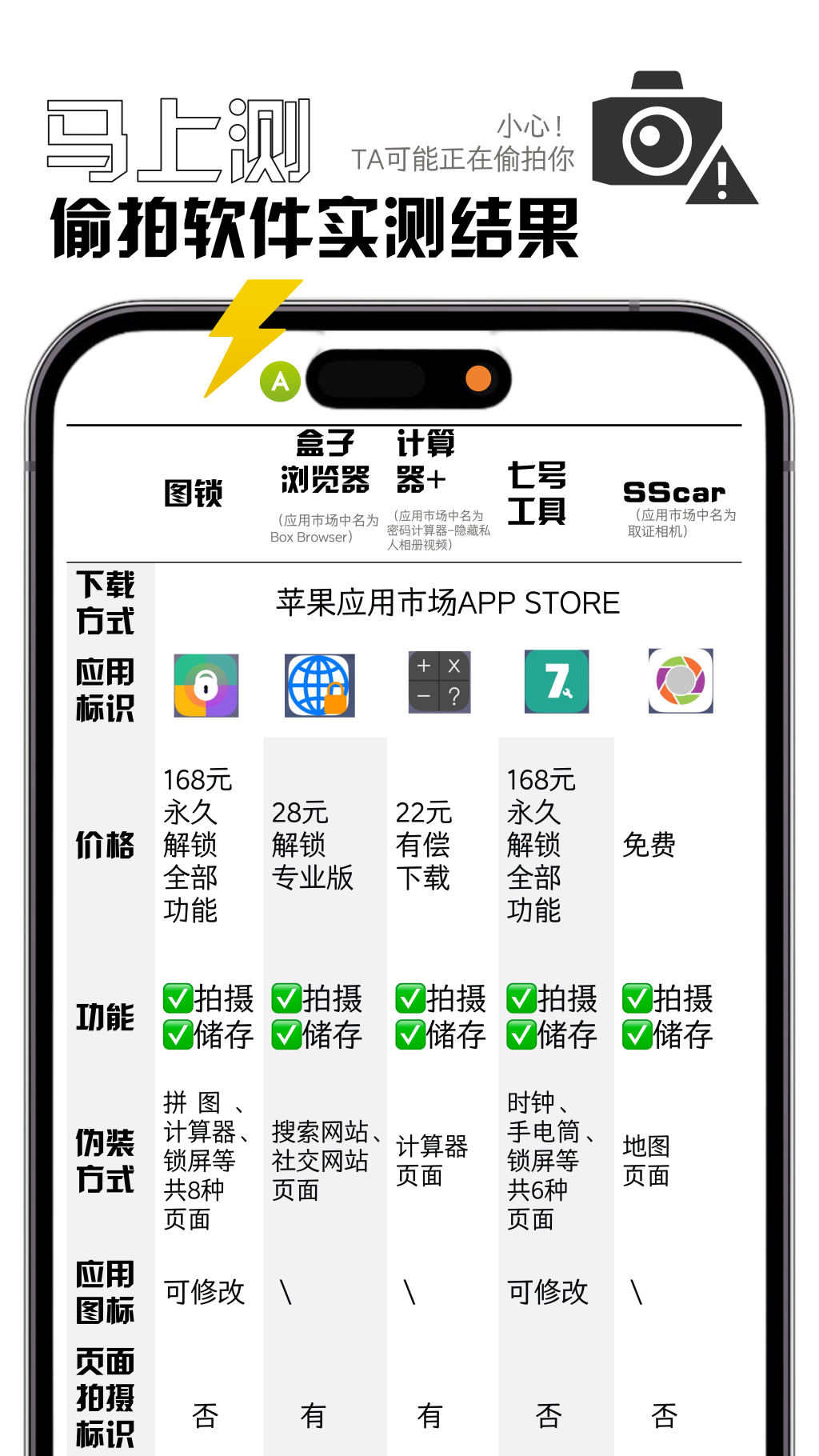 近日,澎湃新聞“馬上測”以“偷拍”為關(guān)鍵詞,在蘋果應(yīng)用商店(App Store)檢索并下載了圖鎖、7 號(hào)工具、盒子瀏覽器(box browser)、計(jì)算器 +(密碼計(jì)算器 - 隱藏私人相冊視頻)和 SSCar(取證相機(jī))五款 APP。