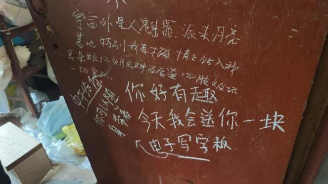圖為沈愷毅在門板上用粉筆與居民溝通