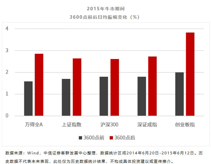 中信證券指出:“回溯2007年、2015年的兩輪牛市,可以發(fā)現(xiàn)在指數(shù)站上3600點后,其日均振幅明顯較前期增加。2007年牛市期間,站上3600點后,滬深300、上證指數(shù)、深證成指的日均振幅均擴大48%以上;2015年牛市期間,站上3600點后,所有主要指數(shù)的日均振幅均擴大45%以上,尤其是萬得全A、創(chuàng)業(yè)板指的振幅更是擴大了79.8%、91.9%。”