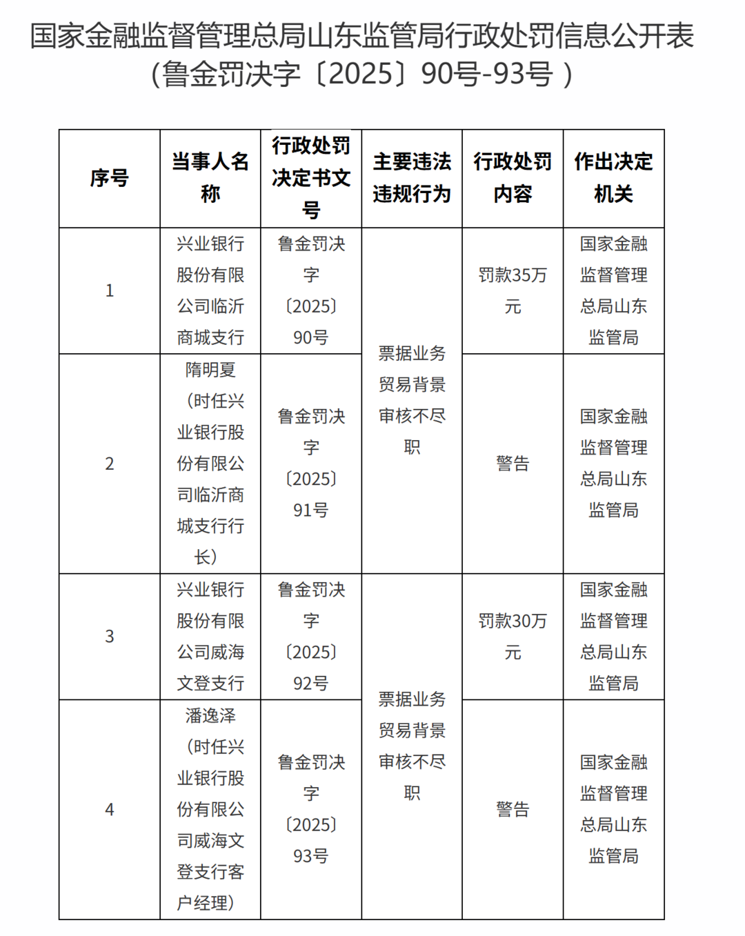 距離上次處罰還未滿一個月,興業(yè)銀行在山東的兩家支行又因違規(guī)受到處罰。7月30日,國家金融監(jiān)督管理總局網(wǎng)站公布的山東監(jiān)管局行政處罰信息公開表(魯金罰決字〔2025〕90號 - 93號 )顯示,興業(yè)銀行股份有限公司臨沂商城支行、隋明夏(時任興業(yè)銀行股份有限公司臨沂商城支行行長)、興業(yè)銀行股份有限公司威海文登支行和逸澤(時任興業(yè)銀行股份有限公司威海文登支行客戶經(jīng)理),因票據(jù)業(yè)務(wù)貿(mào)易背景審核不盡職被處罰。