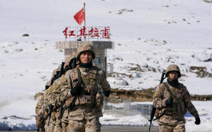 2023年4月13日,邊防連戰(zhàn)士在國門巡邏。新華社記者 趙戈 攝