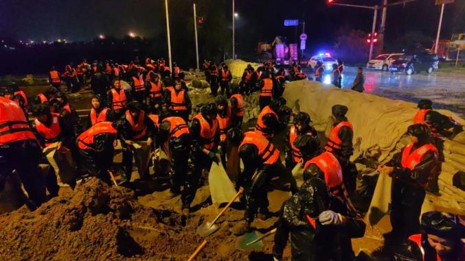 2025年7月,武警北京總隊(duì)千余名官兵在密云區(qū)寧村新橋構(gòu)筑堤壩。新華社發(fā)(蘇鵬 攝)