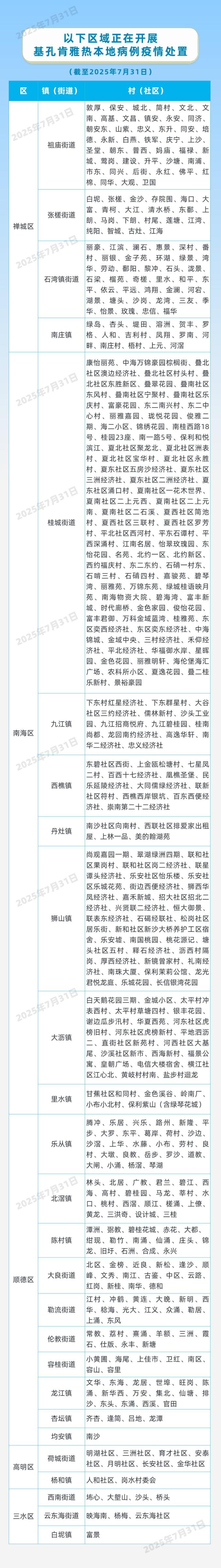 根據佛山疾控7月31號提醒,以下區(qū)域正在開展基孔肯雅熱疫情處置,請做好防范措施。