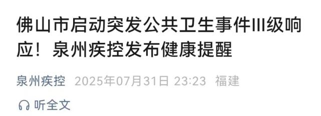 7月29日晚,佛山市政府網發(fā)布消息,結合當前佛山市基孔肯雅熱疫情防控形勢,依據突發(fā)公共衛(wèi)生事件有關應急預案,決定啟動佛山市突發(fā)公共衛(wèi)生事件Ⅲ級響應。