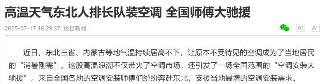 高溫之下,空調(diào)成了“消暑剛需”,銷量爆發(fā)式增長。據(jù)媒體報道,米家空調(diào)銷量最高時達到去年同期的20倍;美的集團數(shù)據(jù)顯示,美的空調(diào)在黑龍江和吉林的增長率高達356%;京東物流數(shù)據(jù)顯示,6月24日至今,黑龍江省內(nèi)空調(diào)送貨、安裝訂單量較去年同期增長超300%,7月4日訂單量更是同比激增400%,創(chuàng)下歷史記錄。空調(diào)供不應(yīng)求,甚至出現(xiàn)脫銷。