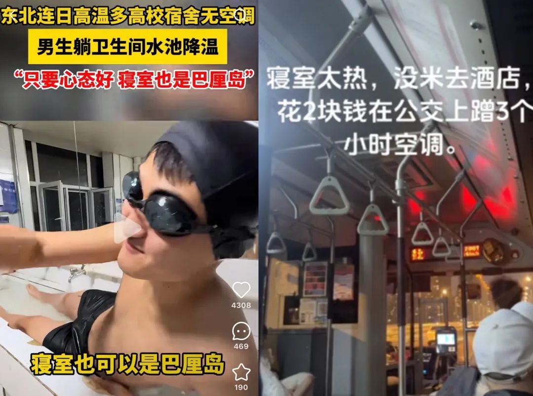 沒有空調(diào)的大學(xué)生只能各想辦法:樓道扎營睡覺、躺衛(wèi)生間水池降溫,有錢的學(xué)生搶住酒店蹭空調(diào),余額不足的學(xué)生寧愿在公交車上坐幾個小時,也不愿回宿舍。校方也只能無奈回應(yīng):“大家都很熱,我們也沒辦法。”