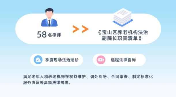 其二,提供全周期法律護航服務,為機構運營注入法治動力。全面推行“一機構一顧問”制度,在全區(qū)實際運營的養(yǎng)老機構設立“法治副院長”駐點服務機制。組建由 58 名資深律師構成的專業(yè)養(yǎng)老法律服務團隊,并出臺《寶山區(qū)養(yǎng)老機構法治副院長職責清單》。團隊成員深度參與養(yǎng)老機構運營全流程,每季度至少開展 1 次現(xiàn)場法治巡診,同時提供 7×24 小時遠程法律咨詢。為老年人和養(yǎng)老機構在權益維護、糾紛調處、合同審查、制定標準化服務協(xié)議等常見法律需求方面提供免費即時解答,在案件委托代理、出庭應訴等深度法律服務方面給予專屬優(yōu)惠。自該機制建立以來,團隊已為星辰家養(yǎng)老院等 4 家養(yǎng)老服務機構提供超 10 次公益法律服務。