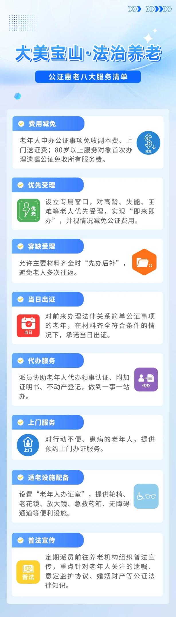 針對繼承、遺囑等高頻需求,上海市寶山公證處和上海市臨港公證處與養(yǎng)老機構代表聯(lián)合發(fā)布“銀法寶”養(yǎng)老公證法律服務清單,推出八項惠老服務措施。寶山公證處還擴充“社區(qū)公證員”隊伍,深入社區(qū)為老年人提供現(xiàn)場業(yè)務咨詢和辦理服務。為 80 周歲以上老年人開辟“綠色通道”,優(yōu)先咨詢、優(yōu)先辦證,減免首次遺囑公證費用。今年以來,已提供 300 余件免費遺囑公證咨詢和辦理服務,累計減免費用超 15 萬元。此外,公證處還提供代擬文書、代為調查取證、代辦認證、上門辦證等延伸服務,讓法治關懷更易感受。