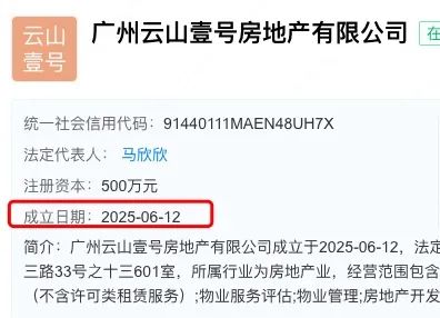 關(guān)鍵問題來了,廣州云山壹號房地產(chǎn)有限公司是怎樣的民企?據(jù)企查查顯示,該公司今年6月12日剛成立,法定代表人為馬欣欣,注冊資本500萬元。