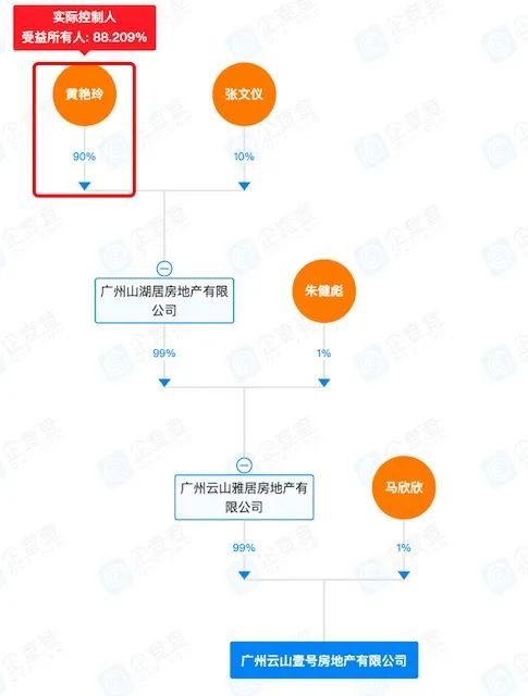 廣州山湖居房地產(chǎn)有限公司背后,自然人股東黃艷玲、張文儀分別持股90%、10%,實際控制人是黃艷玲。