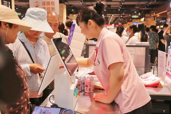 此外,肉禽柜臺(tái)提供切絲、切片、絞肉、剝皮、剔骨等“保姆級(jí)”服務(wù);海鮮柜臺(tái)為高端海鮮提供清洗、打氧等專業(yè)處理。還有很多細(xì)節(jié)關(guān)懷,如調(diào)味品貨架旁放置放大鏡,方便老年人查看說(shuō)明;連卷袋旁配備濕手器,解決開(kāi)袋難題;果切組合按甜度高低標(biāo)明食用順序;毛巾、襪子區(qū)提供隔離袋,避免與生鮮交叉接觸。