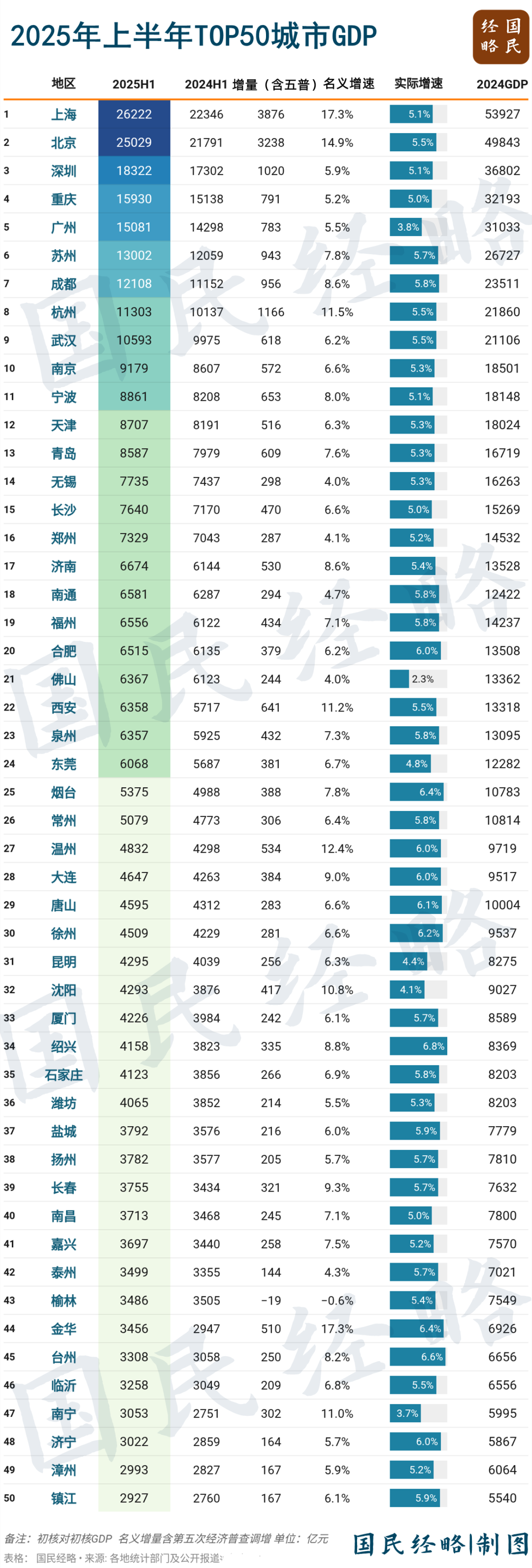 以下是2025年上半年主要城市GDP數(shù)據(jù):
