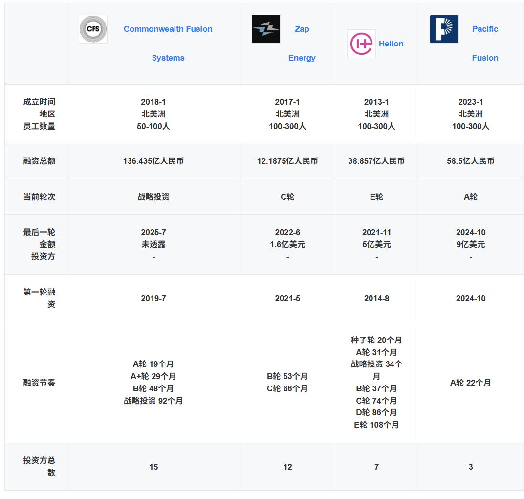 其中,融資最多的公司包括Commonwealth Fusion Systems、Pacific Fusion、Helion、Zap Energy,它們每家的融資總額均突破了10億元以上。