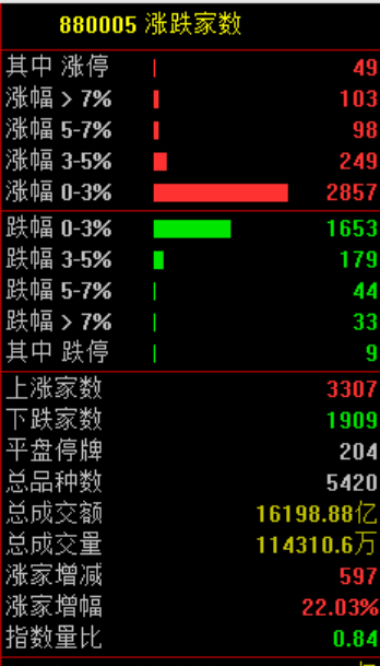 全市場共3307只個股上漲,49只個股漲停,1909只個股下跌。