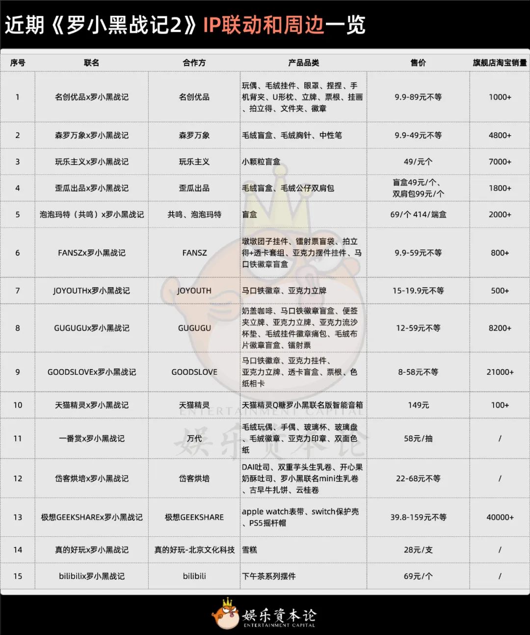 從IP聯(lián)名情況來看,羅小黑有著清晰的調(diào)性。在娛樂資本論統(tǒng)計的15個品牌聯(lián)名中,潮玩類、周邊類聯(lián)名多達11個,餐飲零食相關(guān)的僅有2個,電子產(chǎn)品相關(guān)有2個。其中,帶有強二次元標簽的電玩配件、盲盒、吧唧立牌等產(chǎn)品銷售情況最佳。