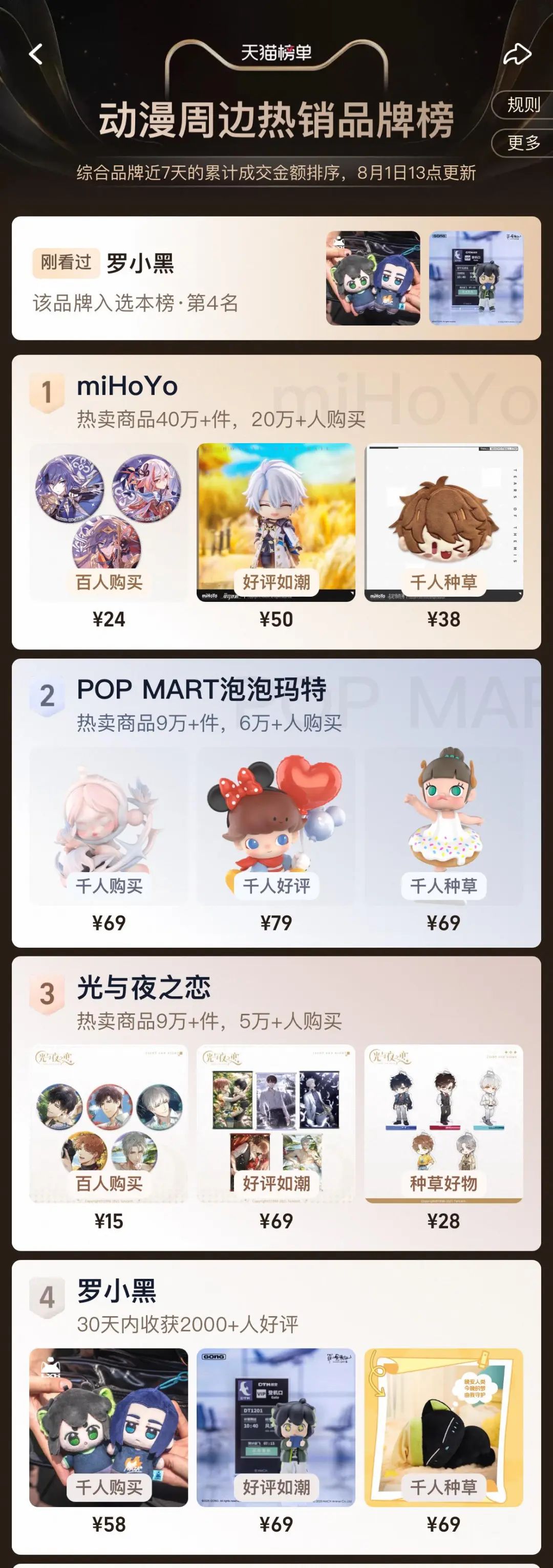 一二線城市保證了羅小黑周邊產(chǎn)品的購買力。在《羅小黑戰(zhàn)記2》上映期間,羅小黑IP登上本周天貓站內(nèi)動漫周邊熱銷品牌榜TOP4,僅次于米哈游、泡泡瑪特、光與夜之戀。