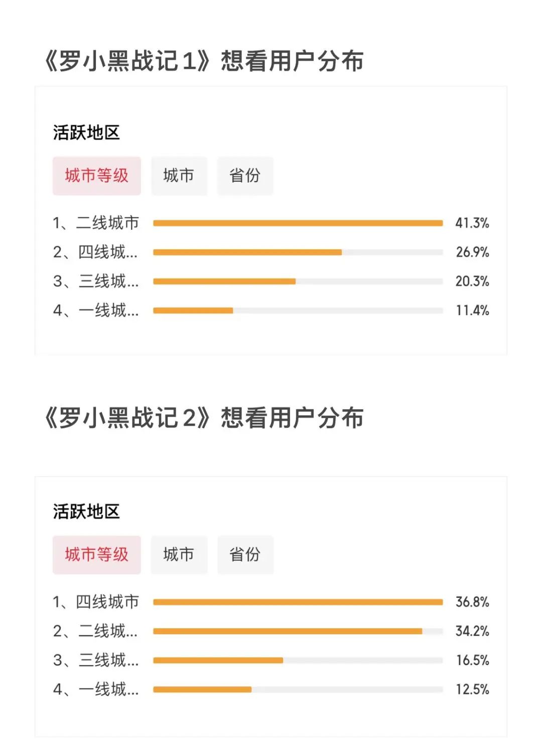 與第一部相比,《羅小黑戰(zhàn)記2》的受眾認知度更廣。第一部受眾主要集中在二線城市,占41.3%,三、四線城市分別只有20%和26%。而第二部受眾分布更均勻,二線城市與四線城市分別占35.2%和36.1%,一二線和三四線城市平分秋色。