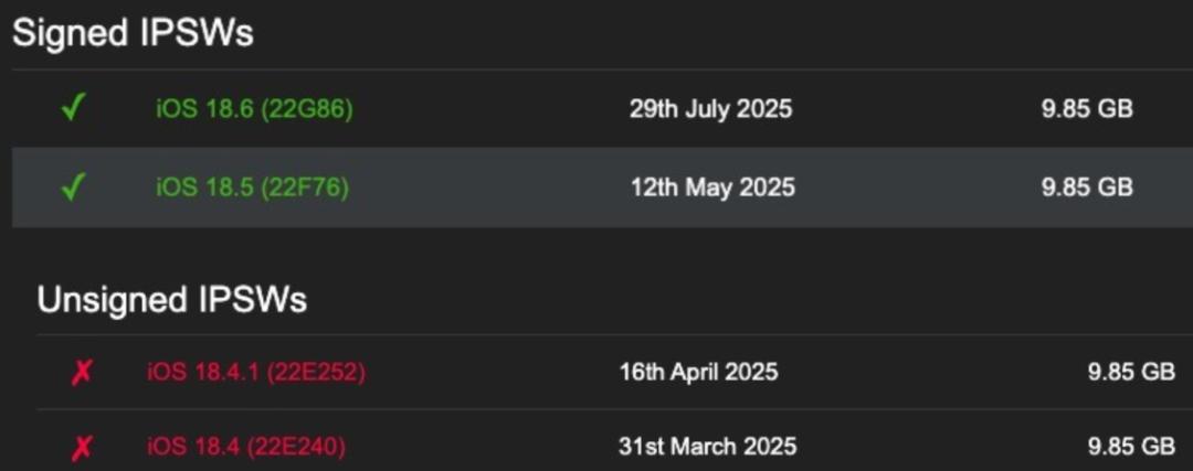 如下圖所示:蘋果仍在簽署iOS 18.5、18.6正式版系統(tǒng),但18.4的已經(jīng)不簽署了,就算下載了也無法降級。