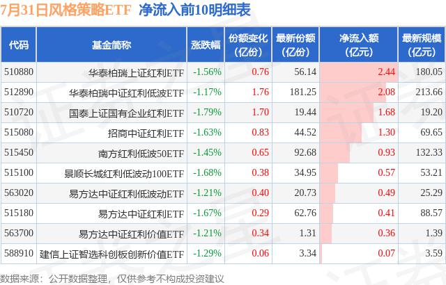 當(dāng)日,有12只風(fēng)格策略ETF基金出現(xiàn)資金凈流入。其中,華泰柏瑞上證紅利ETF(510880)凈流入額居首,其份額增加了7600.0萬份,凈流入額達(dá)2.44億元。