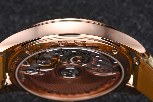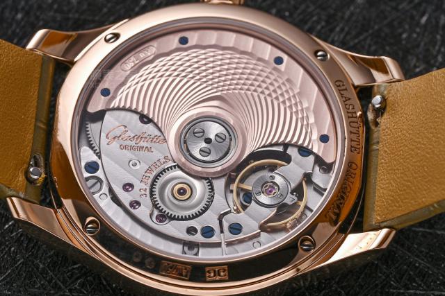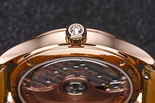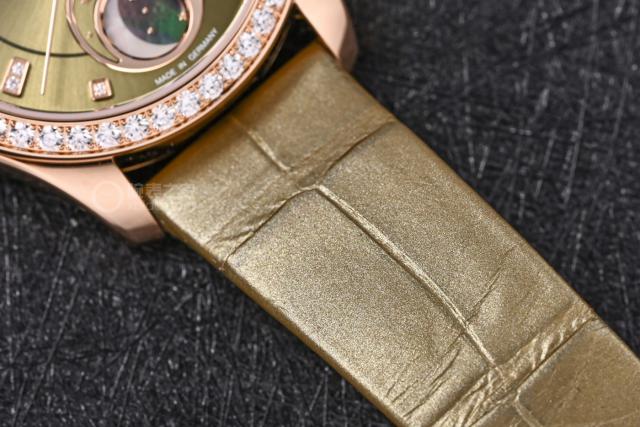 這只機(jī)芯在女表中堪稱頂尖,打磨工藝相當(dāng)出色。機(jī)芯上層有格拉蘇蒂條紋裝飾,搭配經(jīng)典的格拉蘇蒂四分之三夾板,以及奢華的金質(zhì)自動(dòng)陀。這些經(jīng)典的德系元素,無(wú)不彰顯著這枚腕表的精湛做工。