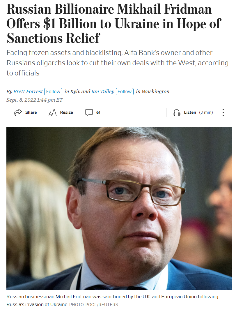 2022年9月,《華爾街日報(bào)》曾發(fā)表標(biāo)題為《俄羅斯億萬富翁米哈伊爾·弗里德曼向?yàn)蹩颂m提供10億美元,希望解除制裁》的文章。