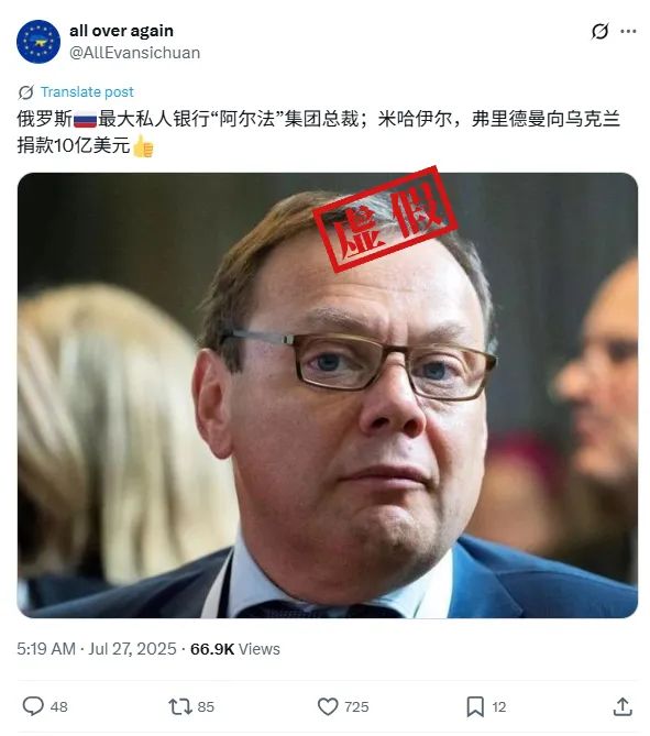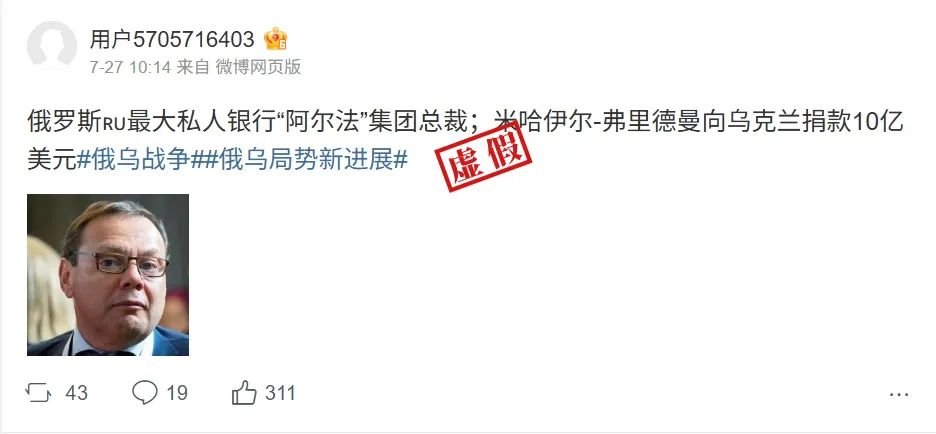 近期,海內(nèi)外社交平臺流傳一種說法,稱俄羅斯最大銀行“阿爾法”集團(tuán)總裁米哈伊爾·弗里德曼向?yàn)蹩颂m捐款10億美元。