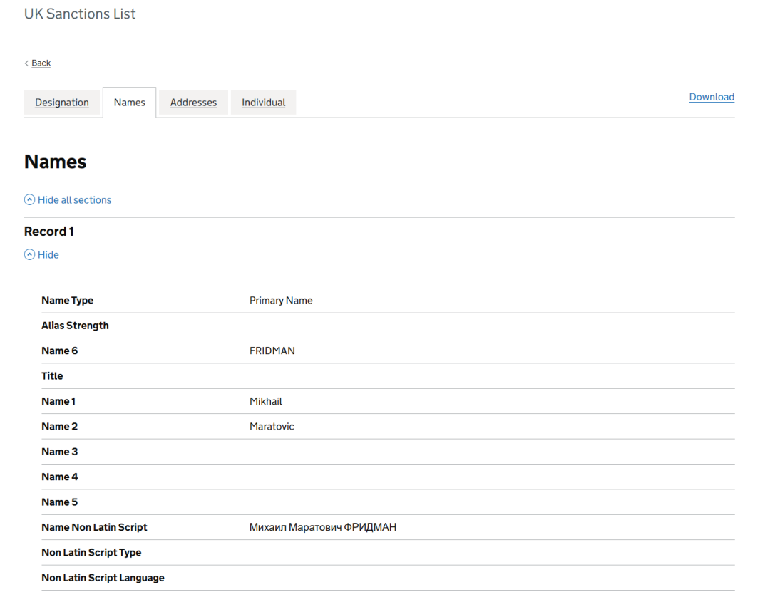 英國政府網(wǎng)站公布的制裁名單中仍有弗里德曼的名字。