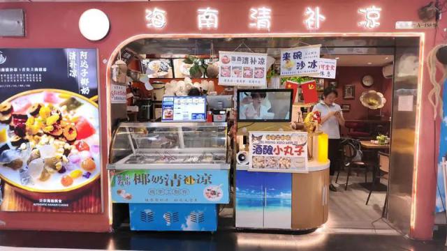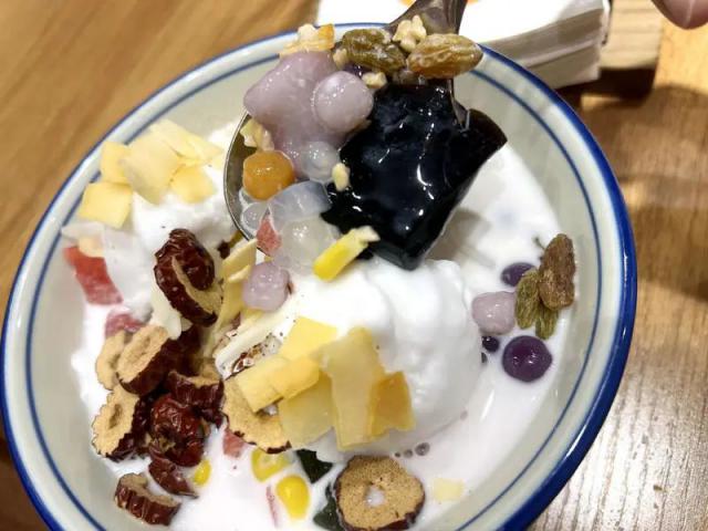 椰奶清補涼的料堆得像小山一樣,椰果、西瓜、山楂、芋園等鋪滿了整個碗。一口下去,椰香四溢,就像它的名字一樣,吃一碗就能感受“舌尖上的清涼”。