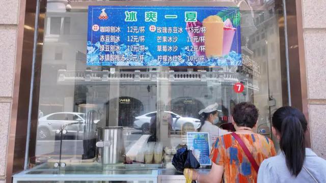 沈大成的刨冰在南京路步行街已經(jīng)售賣了 10 多年,今年又有新玩法。除了經(jīng)典的綠豆、赤豆刨冰,還創(chuàng)新推出了咖啡刨冰。