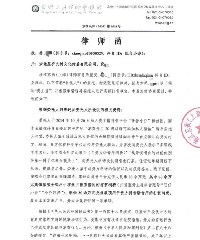 律師函稱“旺仔小喬”涉嫌構(gòu)成詐騙罪,要求全額返還充值打賞款項,并停止以虛假承諾誘導(dǎo)用戶打賞的行為。